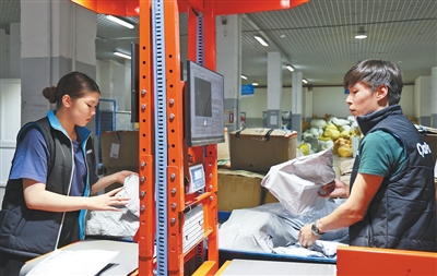 物流分拣中心工作人员正在分拣整理包裹。人民日报记者孟祥麟摄